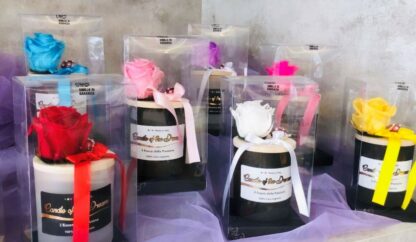 queste candele si differenziano per la rosa disidratata che profuma dell’aroma della candela, disponibili in vari colori